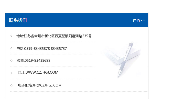 地址:常州市新北區友邦商務大廈1幢16、17層  電話:0519-85101652  傳真:0519-85112595  郵編:213022  網址:www.cz-jiayue_cn.zhuce0571.com  郵箱:xiajifengaa@163.com